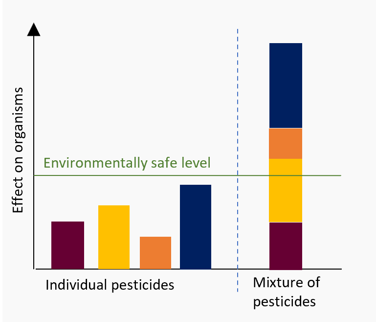 - Pesticide mixtures significantly increase toxicity risks that are severely underestimated when only considering individual pesticides.